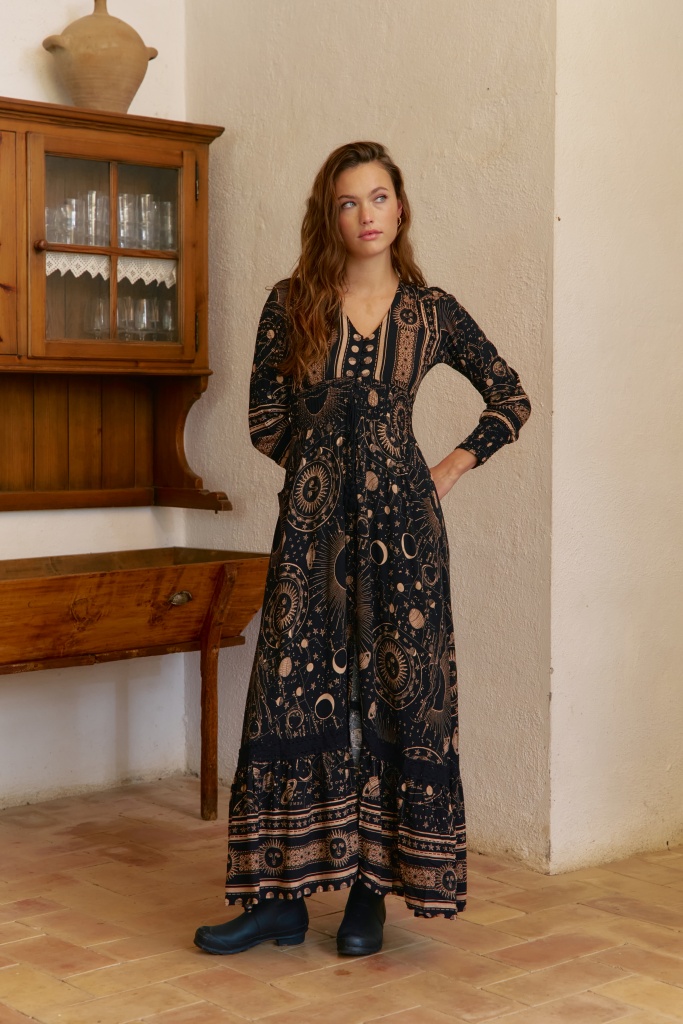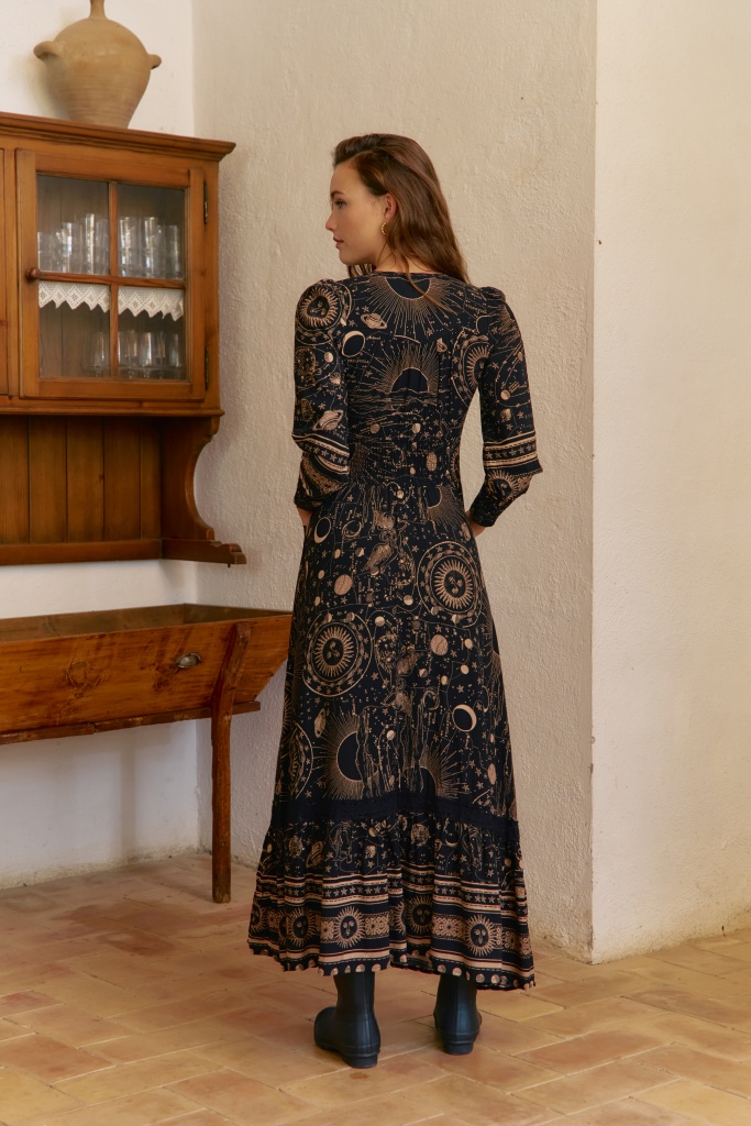 • Šaty Astrid okouzlí na první pohled svým originálním potiskem inspirovaným hvězdnou oblohou. Kombinace černé a zlatavě béžové barvy vytváří elegantní kontrast, který působí tajemně a zároveň žensky.