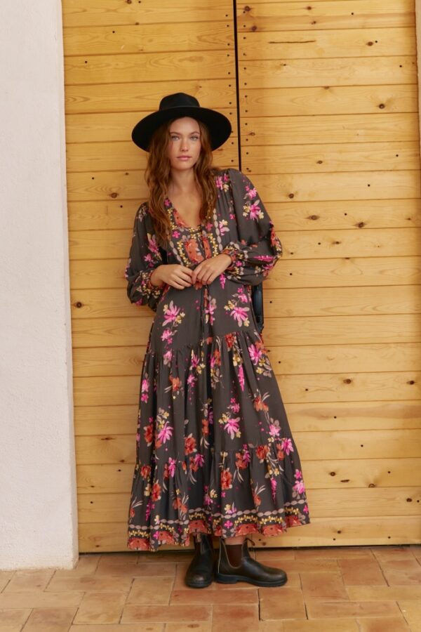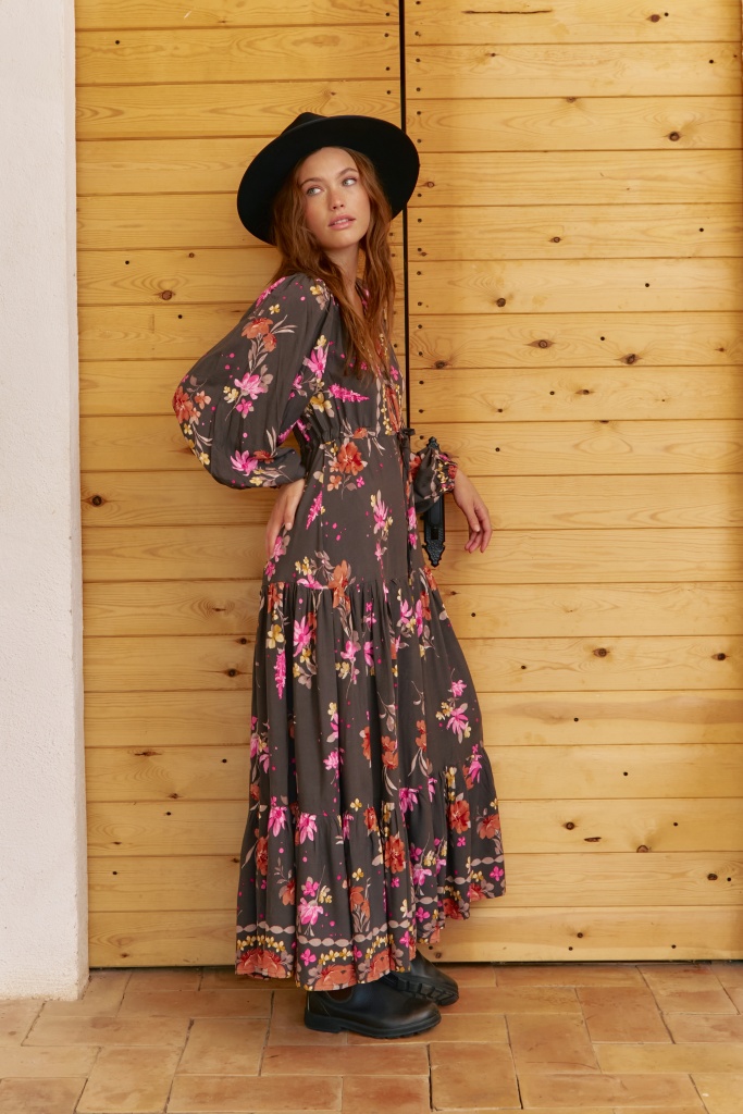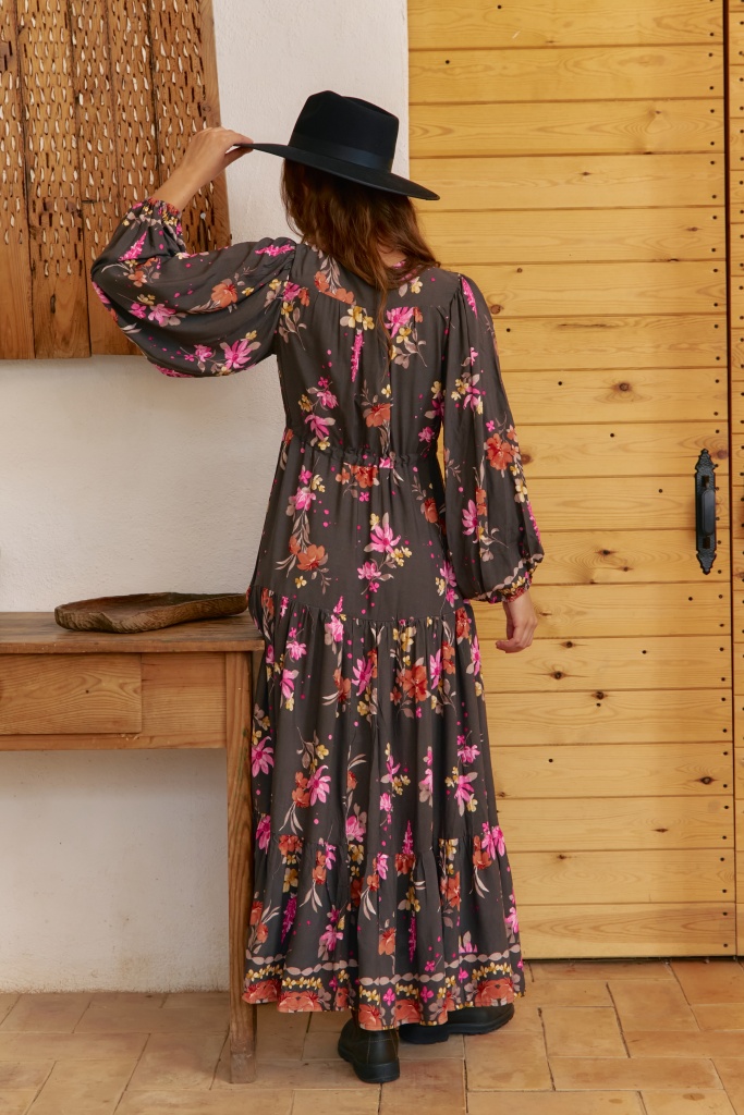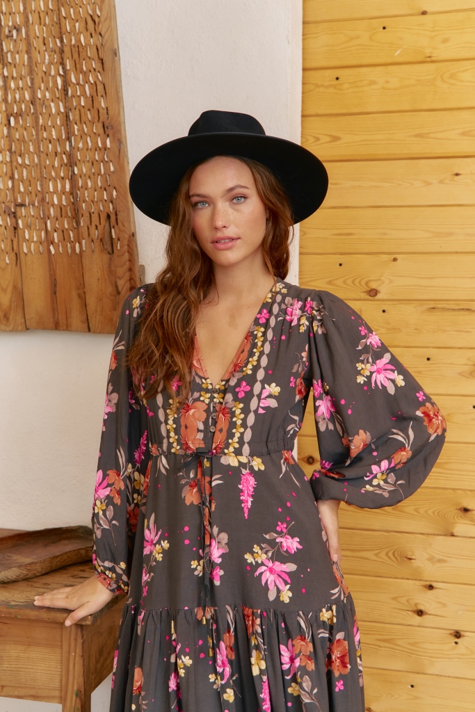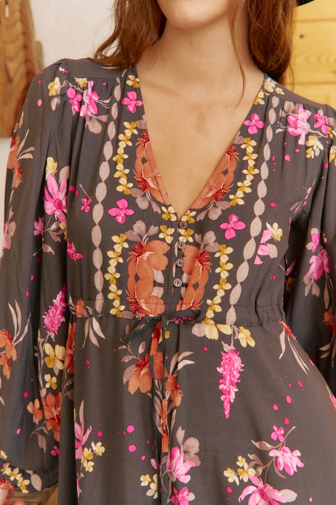 • Hlubší výstřih do „V“ s decentním zapínáním na knoflíčky a volné balónové rukávy s pružným zakončením dodávají šatům ležérní boho charakter.