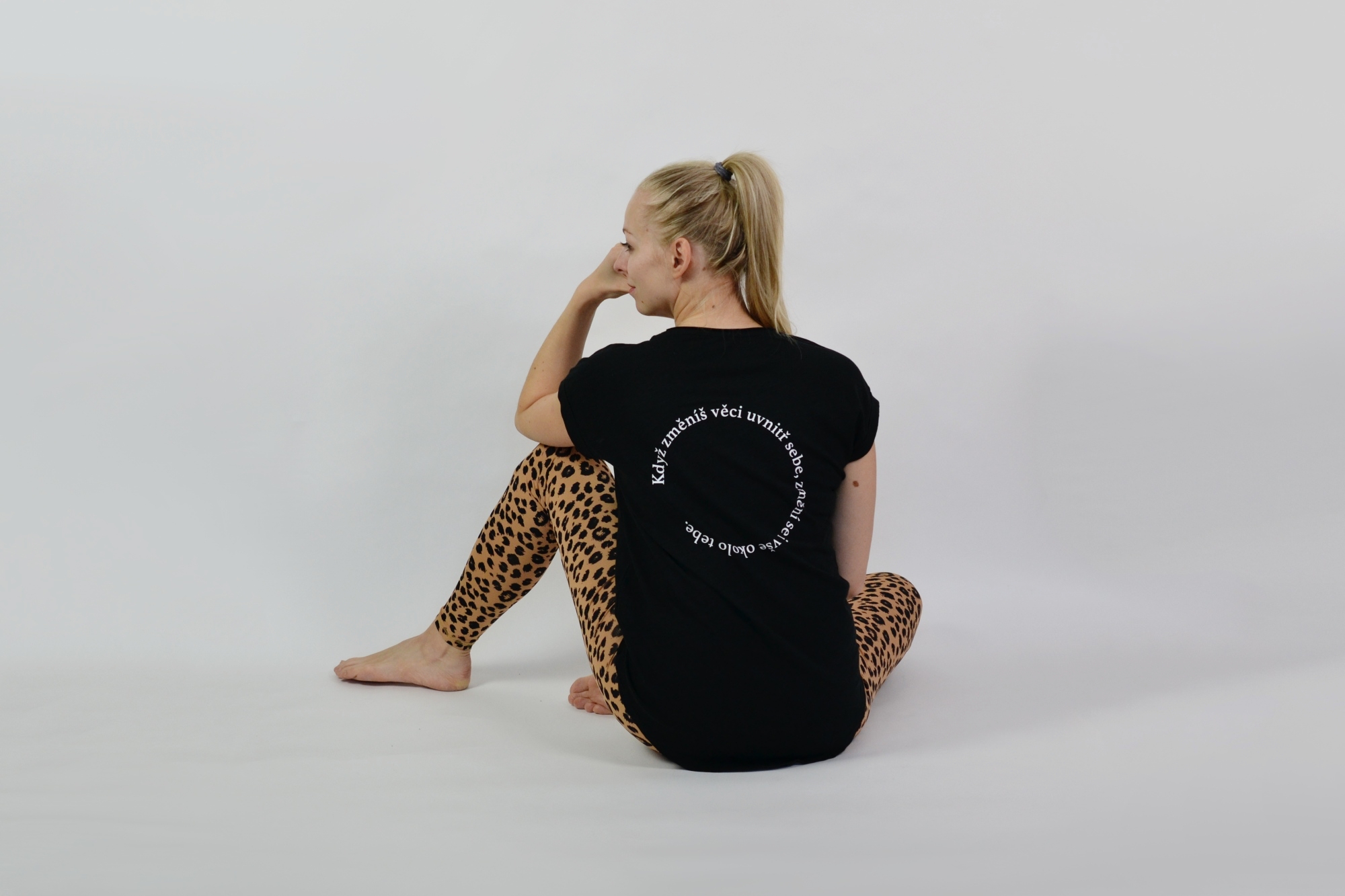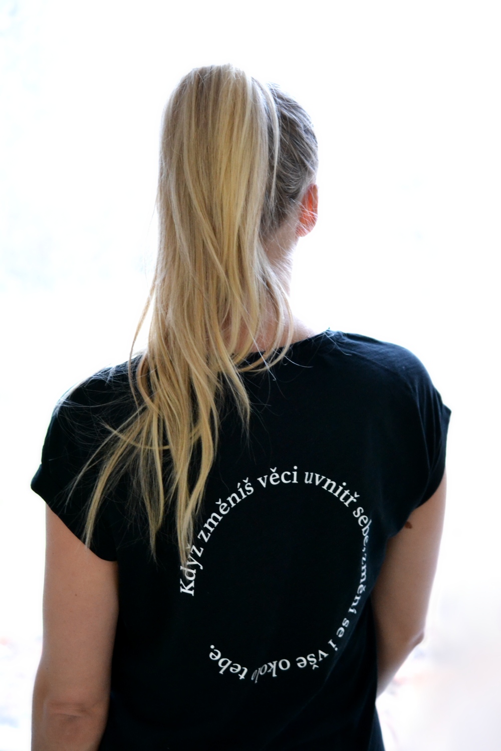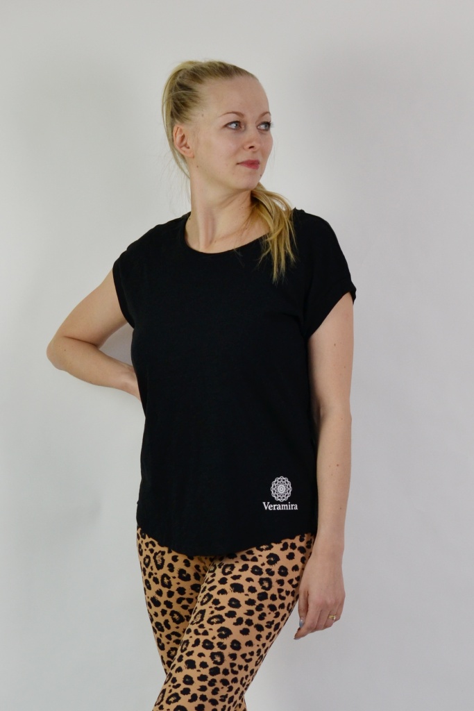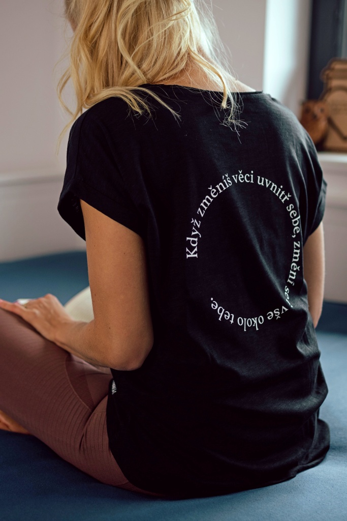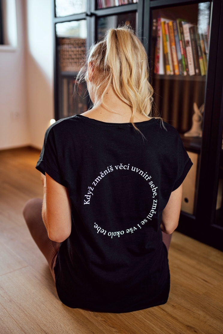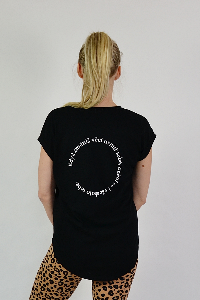 Volné dámské černé tričko „Můj osud, moje volba“ ze 100% bavlny s nopkovou texturou, extra prodlouženým zadním dílem a ohybem na rukávu. Z dílny Veramira.