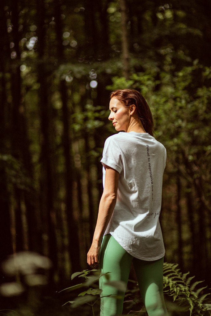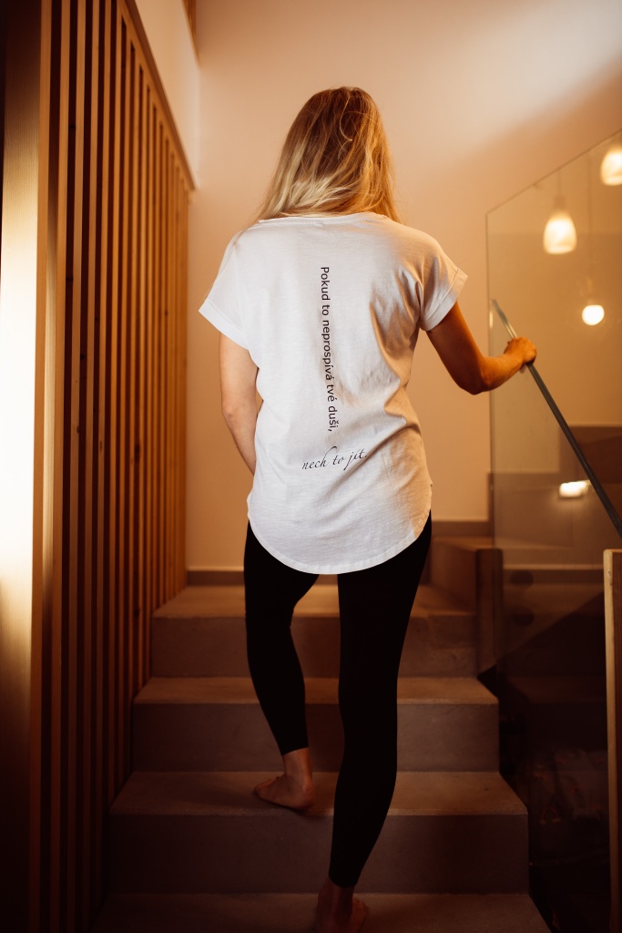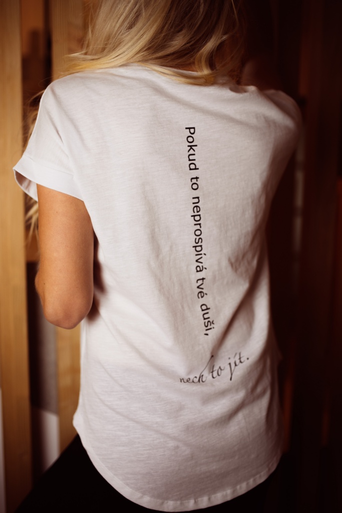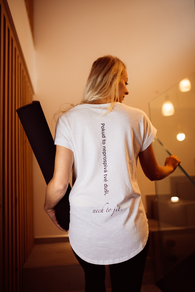Bílé triko „Nech to jít“ ze 100% bavlny s nopkovou texturou, extra prodlouženým zadním dílem a ohybem na rukávu. Z dílny Veramira.
