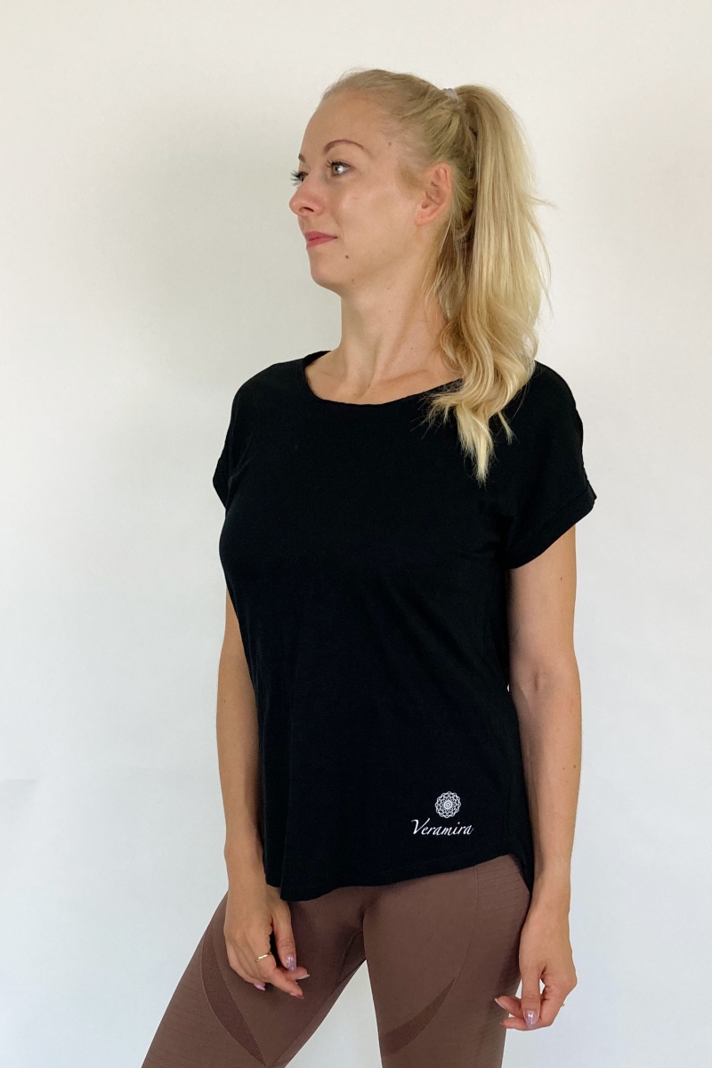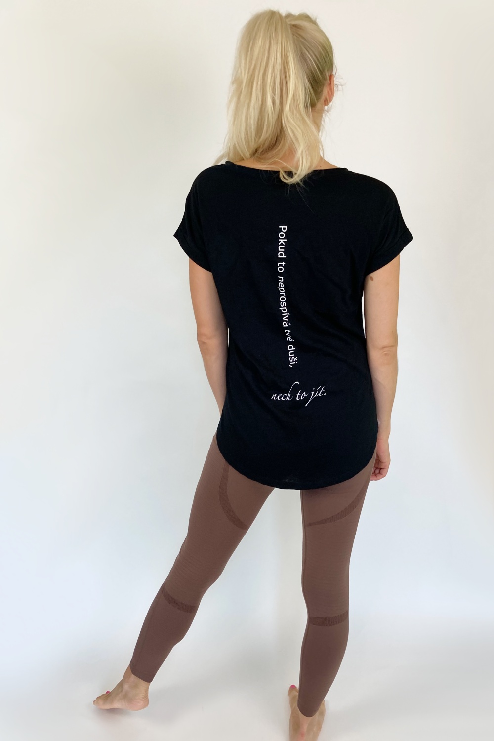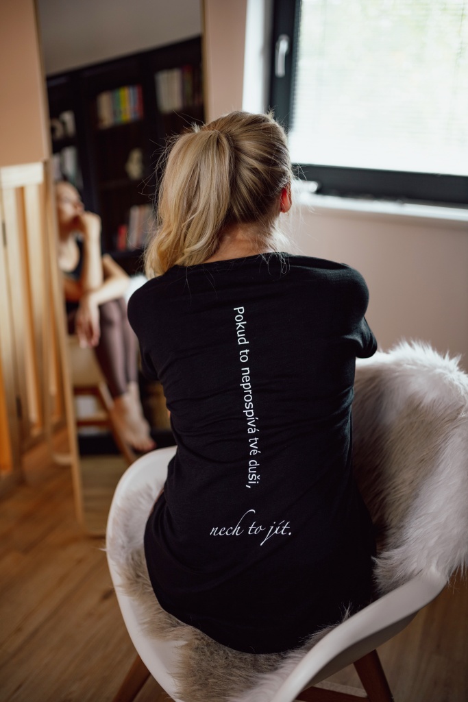 Černé triko „Nech to jít“ ze 100% bavlny s nopkovou texturou, extra prodlouženým zadním dílem a ohybem na rukávu. Z dílny Veramira.